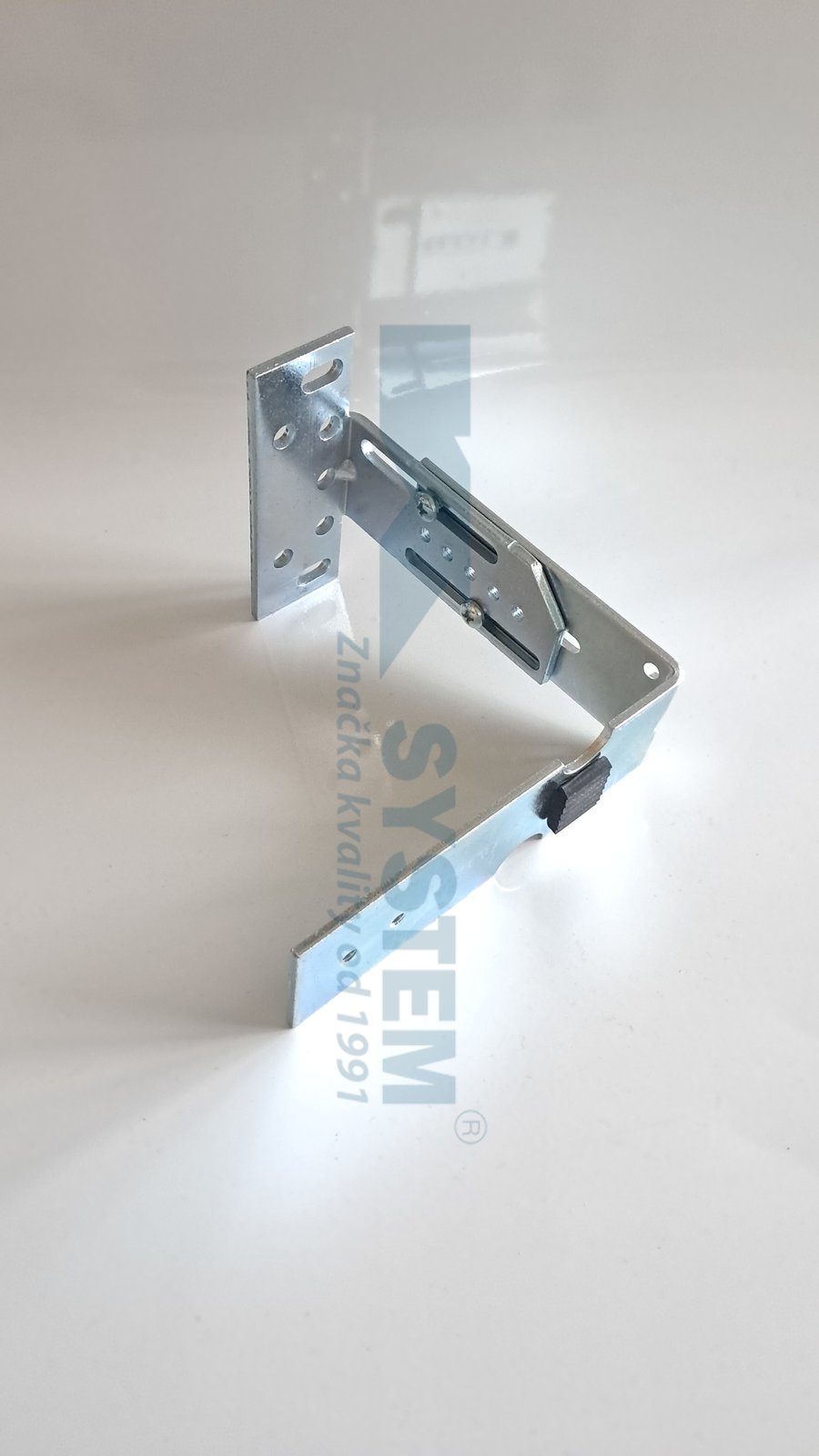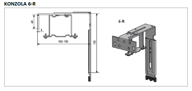 Konzola pro montáž krycího plechu venkovních žaluzií s krátkou dosedací plochou, kterou je možné použít při montáži žaluzie na rám okna, případně tam, kde není dostatek místa pro upevnění jiného typu konzoly. Jedná se o nastavitelnou konzolu (nastavitelná hloubka – rozměr B). K dispozici jsou dva typy s různým rozsahem nastavení. Konzoly jsou vyrobeny z ocelového plechu o tloušťce 3 mm a povrchově upravené pozinkováním. Lze je doplnit o prodloužení typu A, B nebo C.
